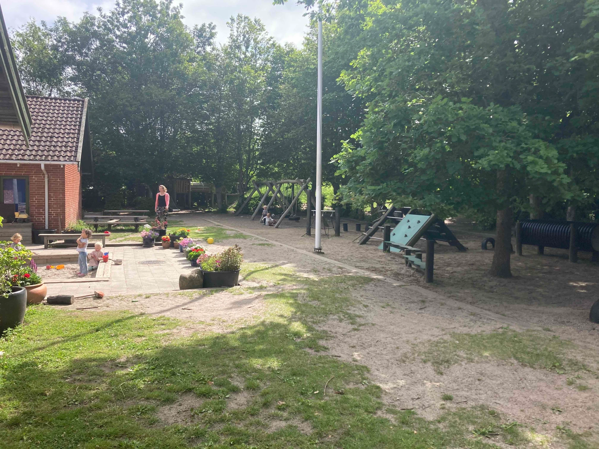 Vi har en fantastisk stor og dejlig legeplads, som både giver mulighed for udendørs fordybelse og kreativitet samt mere motoriske udfordringer eller vilde lege.