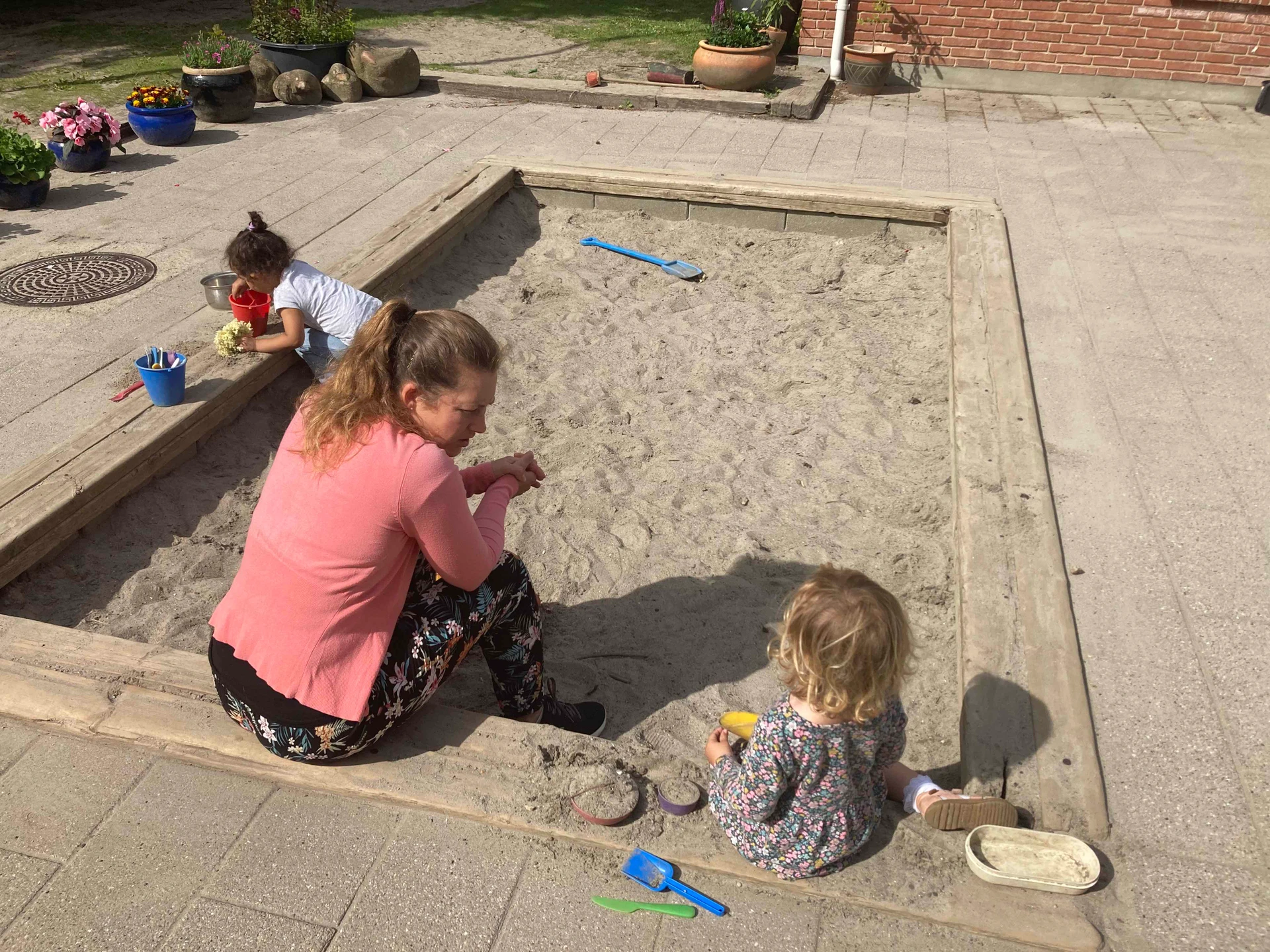 Vi har vores egen lille ende af legepladsen, og bruger samtidig rigtig meget den store legeplads med de største børn sammen med børnehaven. I det hele taget har vi et meget tæt samarbejde med børnehaven, hvilket letter børnenes overgang, når de fylder tre år, fordi de i forvejen har kendstab til andre børn og medarbejdere i huset.